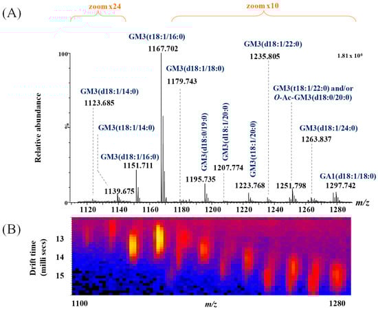 (A) Extracted (−) nanoESI-IMS MS corresponding to singly charged GA1 and GM3 ganglioside species, obtained from the total BMLA driftscope display (drift time versus m/z), illustrating the distribution of electrosprayed GG ions; (B) driftscope plot (m/z versus drift time) showing GA1 and GM3 species detected in BMLA.