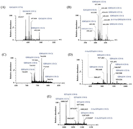 Extracted (−) nanoESI IMS mass spectra of doubly charged GG species from the total BMLA driftscope display: (A) GA3 and GM4, (B) GA1 and GM3, (C) GM1 and GD3, (D) GD1 and GT3, and (E) GT1.