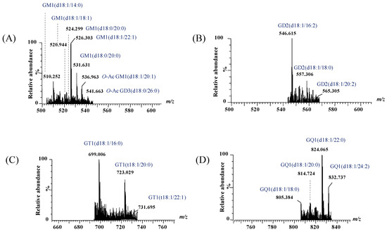 Another noteworthy observation pertains to the heterogeneity of the ceramide (Cer) moieties in the GG species expressed in BMLA. The shortest fatty acid chain (C12) was found in GM4(d18:1/12:2), GT1(d18:1/12:3), and GT1(d18:1/12:4) species, whereas the longest (C32) was detected exclusively in GM3(d18:1/32:2). Most GGs, more exactly 115 species or over 76%, contained ceramides with fatty acid chains ranging from C16 to C24. Additionally, according to the data presented in Table 1 and Figure 3, Figure 4 and Figure 5, 26 species, mainly from the GM, GT, and GD classes, contained polyunsaturated fatty acid (PUFA) moieties.