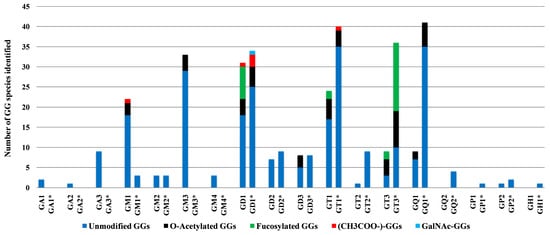 Number of GG species identified by IMS-MS in BMLA tissue and C65Y (indicated by asterisk) [73], plotted according to glycan core composition and sialylation degree.