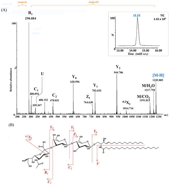Given the elevated incidence of GM3 glycoforms in BLMA, and the predominance of saturated fatty acids (SFAs) over PUFAs, as reported in the Section 3, the ion detected at m/z 1235.805 (Figure 3), assigned by exact mass calculation to GM3 with a ceramide composition of (d18:1/22:0), was selected for detailed structural analysis. The precursor ion was isolated and subjected to CID fragmentation under optimized conditions, with a 2 min infusion and collision energy ramped from 40 to 65 eV, to generate diagnostic fragment ions informative for both the saccharide moiety and ceramide composition. The resulting CID MS/MS (Figure 7A), along with the fragment ion assignment and the deduced GM3 structure (Figure 7B), reveals the formation of diagnostic fragment ions.