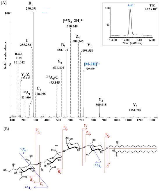 The fragmentation spectrum in Figure 8A reveals several internal fragments arising from cross-ring cleavages that further substantiatethe proposed structure. These included the doubly deprotonated 1,5X3 at m/z 610.348, the singly deprotonated 1,5A1 at m/z 221.086, and 2,4A4 at m/z 493.145, arising from internal fragmentation of Neu5Ac and glucose (Glc). Collectively, the fragmentation data provided robust structural confirmation for GD3(d18:1/16:0), validating both the disialylated glycan chain and its ceramide composition, and exemplifying the utility of CID MS/MS in glycosphingolipid characterization.