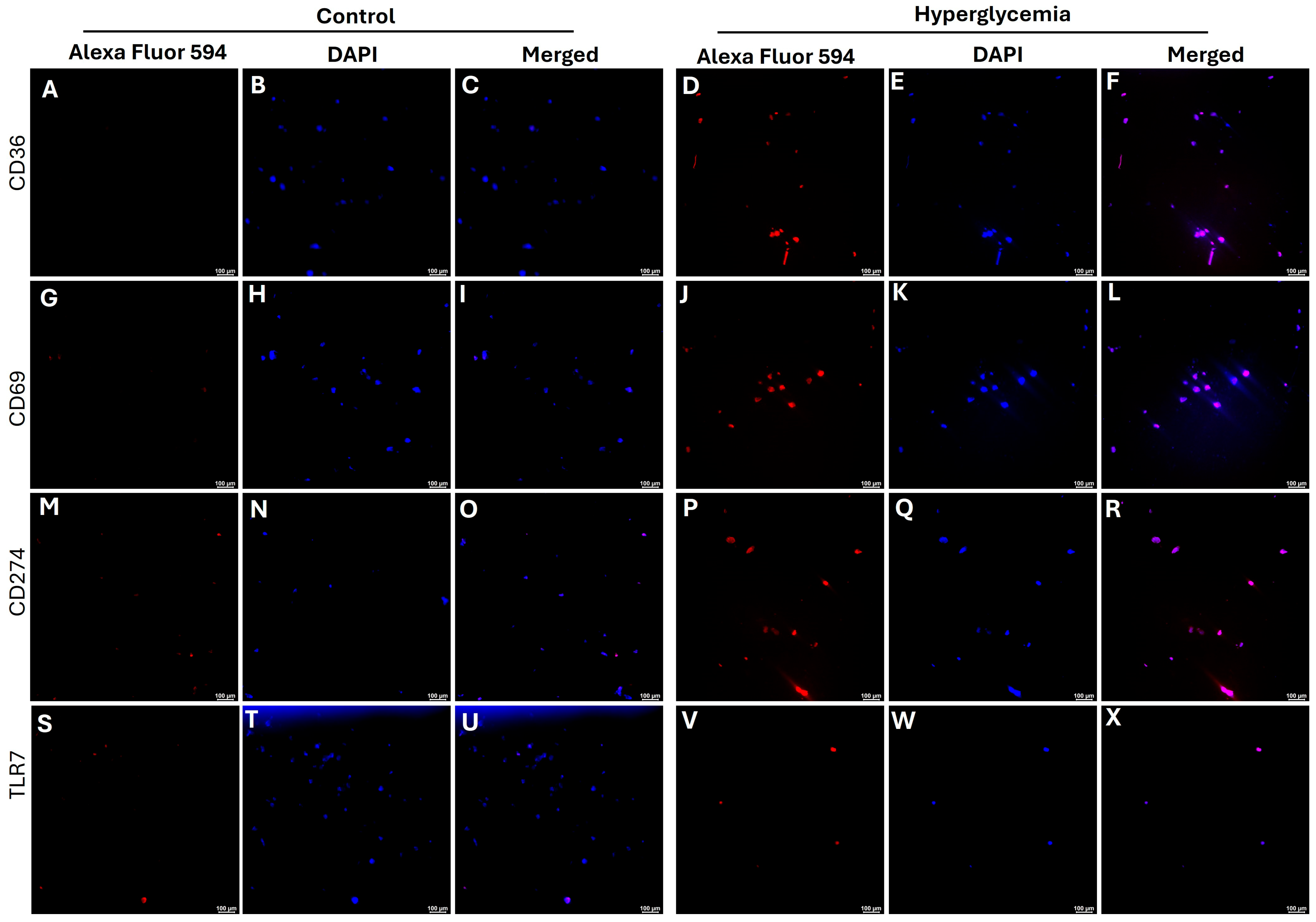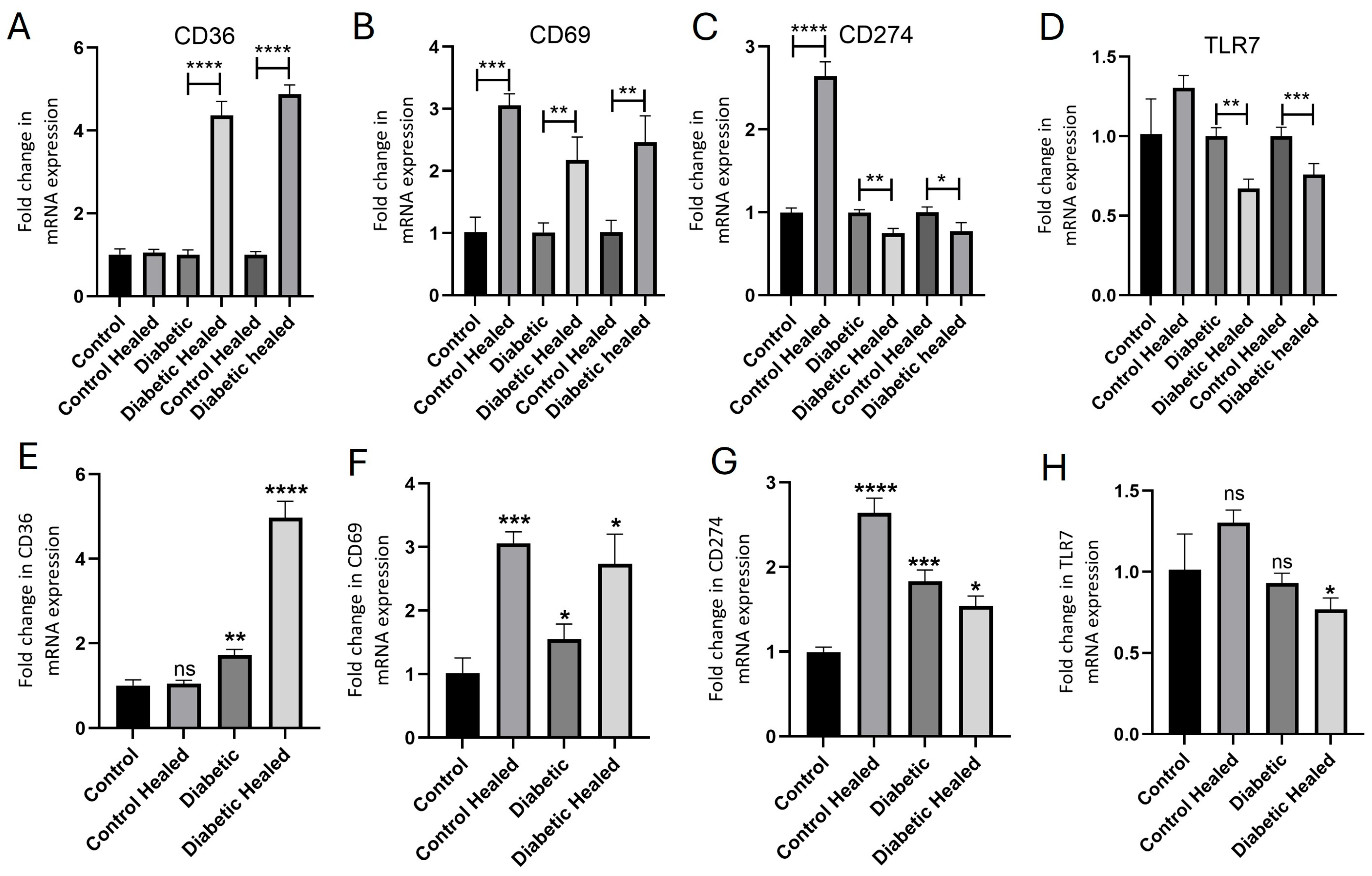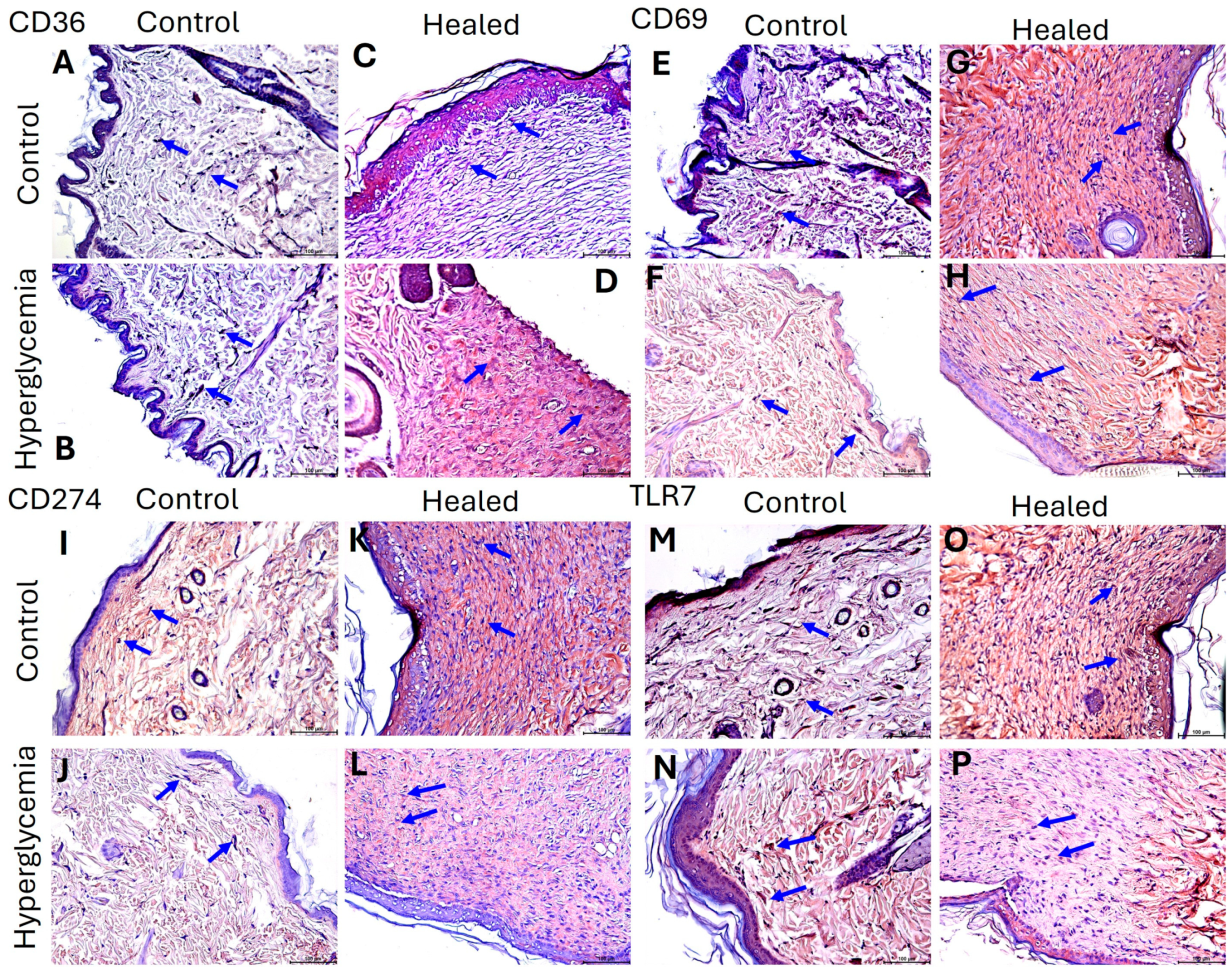 2.3. Hyperglycemia Modulate the Protein Expression of CD36, CD69, CD274, and TLR-7 in Healed Tissues