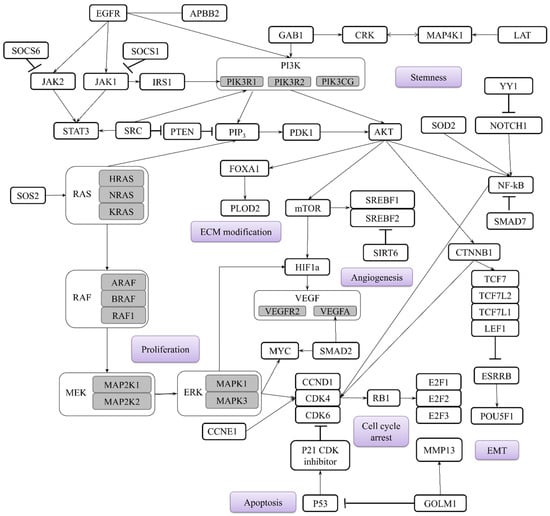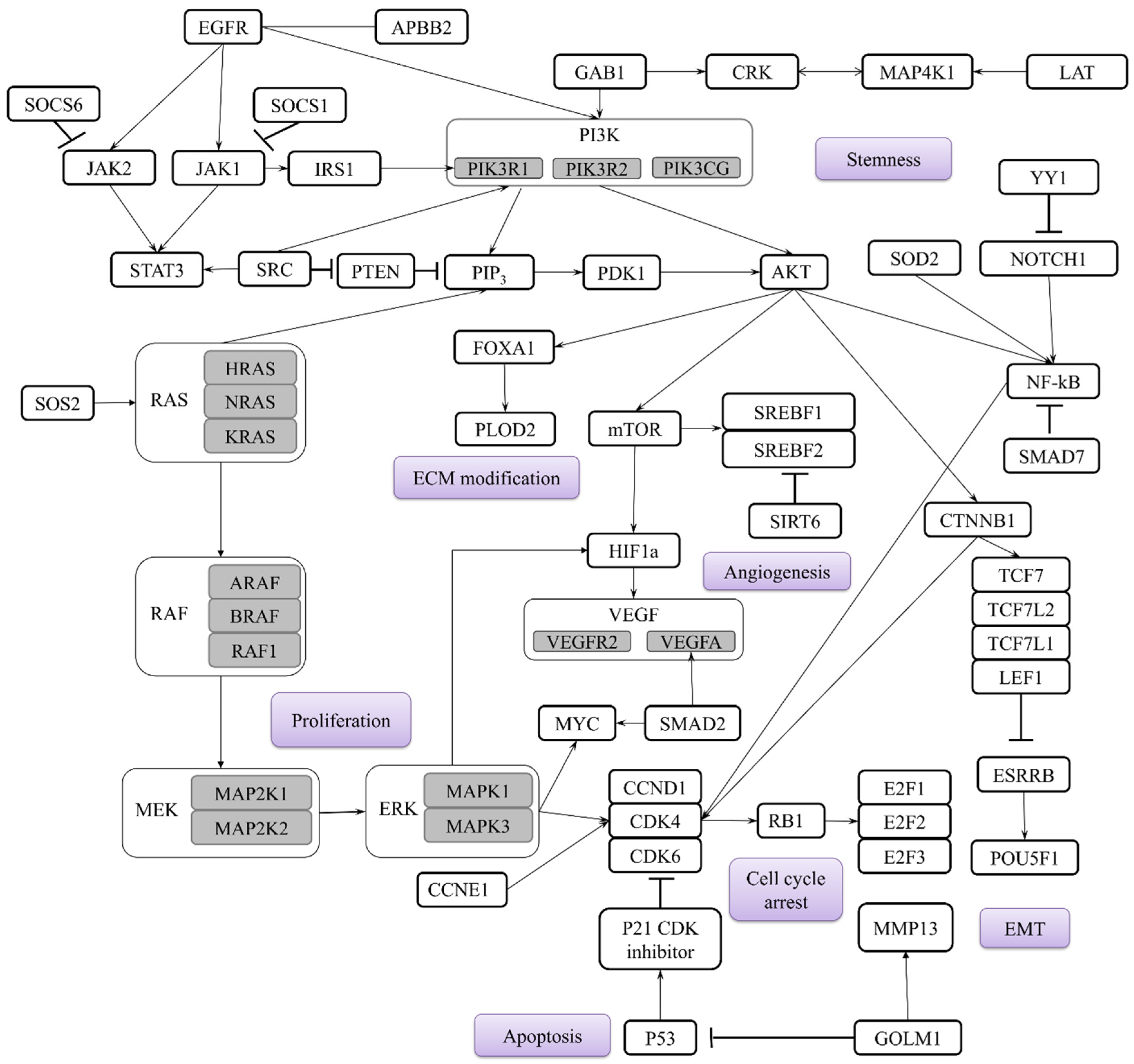 Main genes targeted by miRNAs in early-stage NSCLC and main biological processes involved in the carcinogenesis highlighted in purple. Subtypes of the main genes are highlighted in grey.