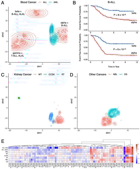Subtype-specific RP mRNA signature in pediatric cancers from TARGET. (A) Two types of blood cancers had different RP mRNA signatures, and ALL had three distinct RP mRNA subtypes. (B) Two RP mRNA subtypes of B-cell ALL had significantly different prognoses. (C) Three types of kidney cancers had different RP mRNA signatures. (D) Two other cancer types from TARGET had different RP mRNA signatures. (E) log2 fold change in each cancer type compared to the cluster with the highest number of samples (cluster gamma of ALL). ALL = Acute Lymphoblastic Leukemia, B-ALL = B-cell Acute Lymphoblastic Leukemia, T-ALL = T-cell Acute Lymphoblastic Leukemia, ALAL = Acute Leukemia of Ambiguous Lineage, AML = Acute Myeloid Leukemia, WT = Wilms Tumor, CCSK = Clear Cell Sarcoma of the Kidney, RT = Rhabdoid Tumor, NBL = Neuroblastoma, OS = Osteosarcoma.