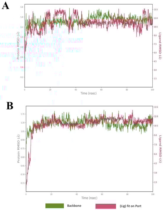 Root mean square deviation (RMSD) graphs for the hit compounds, (A): compound A, (B): compound B. The green graph shows fluctuations in the protein backbone from the initial reference point while the red shows the ligand fluctuations. The RMSD profile of the ligand is with respect to its initial fit to the protein binding pocket indicates that all ligands did not fluctuate beyond a 4 Å range after initial stabilization.