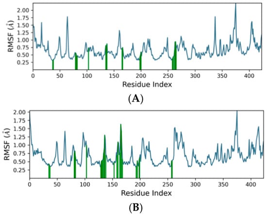 Root mean square fluctuation (RMSF) graphs for the protein complexed with (A): Compound A and (B): Compound B. The blue graph shows fluctuations along the protein chain with peaks indicating areas of the protein that fluctuate the most during the simulation. Protein residues that interact with the ligand are marked with green-colored vertical bars.