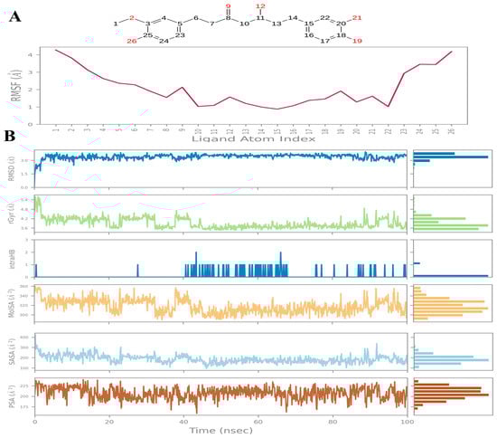 Compound B: (A) Ligand Root Mean Square Fluctuation. (B) Ligand properties: From the top graph: Ligand RMSD: Root mean square deviation of a ligand with respect to the reference conformation; Radius of Gyration (rGyr); Intramolecular Hydrogen Bonds (intraHB): Number of internal hydrogen bonds (HB) within a ligand molecule; Molecular Surface Area (MolSA): Molecular surface calculation with 1.4 Å probe radius; Solvent Accessible Surface Area (SASA); Polar Surface Area (PSA).