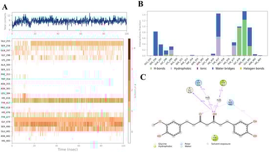 Interaction diagram of hit compound A within the eLtaS binding pocket. (A) Interaction of compound A with residues in each trajectory frame. The depth of color indicating the higher the interaction with contact residues. (B) The protein–ligand contacts showing the bonding interactions fraction and the nature of the interactions. (C) Graphical 2D illustration of compound A interacting with the protein residues during MD simulation.