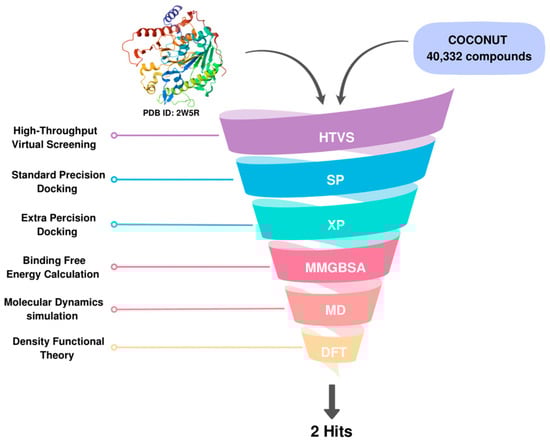 Virtual screening workflow for hit identification. Natural compounds from the COCONUT database (40,332 molecules) were screened against the target protein (PDB ID: 2W5R) using a sequential pipeline: HTVS → SP → XP docking → MM-GBSA → MD simulation. This funnel-based approach yielded two final hit candidates with favorable binding and stability profiles.