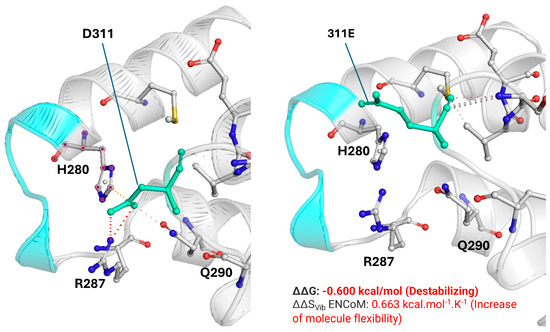 Structural comparison of the wild-type Asp311 and mutant Glu311 residues and their impact on the KMSKS motif of YARS2. Left: wild-type Asp311 (D311, green) within the anticodon-binding domain, showing its spatial relationship with the KMSKS loop (cyan) and neighboring residues His280, Arg287, and Gln290. Right: mutant Glu311 (311E, green) modeled at the same coordinates, displaying changes in the side chain that alter local packing and the interaction network around the KMSKS motif. DynaMut2 predicts a destabilizing effect for the p.(Asp311Glu) substitution with ΔΔG = −0.600 kcal/mol and an increase in molecular flexibility with ΔΔSVib ENCoM = +0.663 kcal·mol−1·K−1. The ΔΔG for other pathogenic variants such as p.(Gly46Asp) [catalytic domain], p.(Cys369Tyr) [anticodon-binding domain], and Gly244Ala [catalytic domain] are −0.84 kcal/mol, −0.82 kcal/mol, and −0.52kcal/mol, respectively.