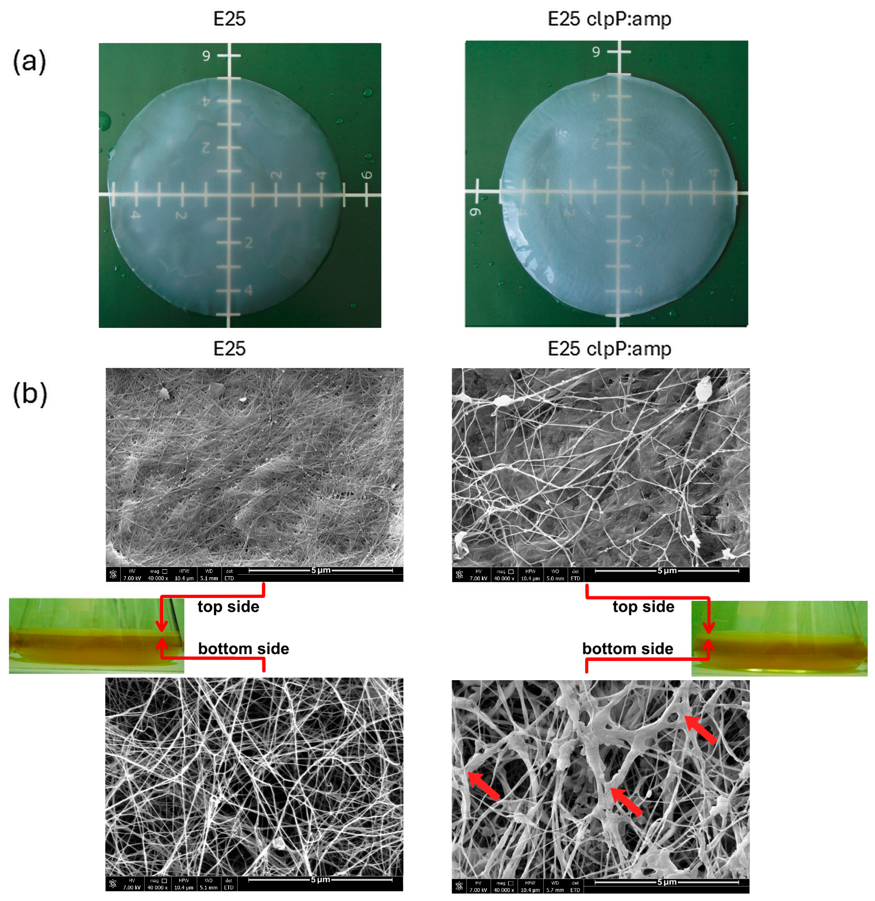 - Laurent, J.M.; Steinacher, M.; Kan, A.; Ritter, M.; Leutert, M.; Bienz, S.; Häberlin, D.; Kumar, N.; Studart, A.R. Genetic Impacts on the Structure and Mechanics of Cellulose Made by Bacteria. Adv. Sci. 2025, 12, e05075. [Google Scholar] [CrossRef] [PubMed]