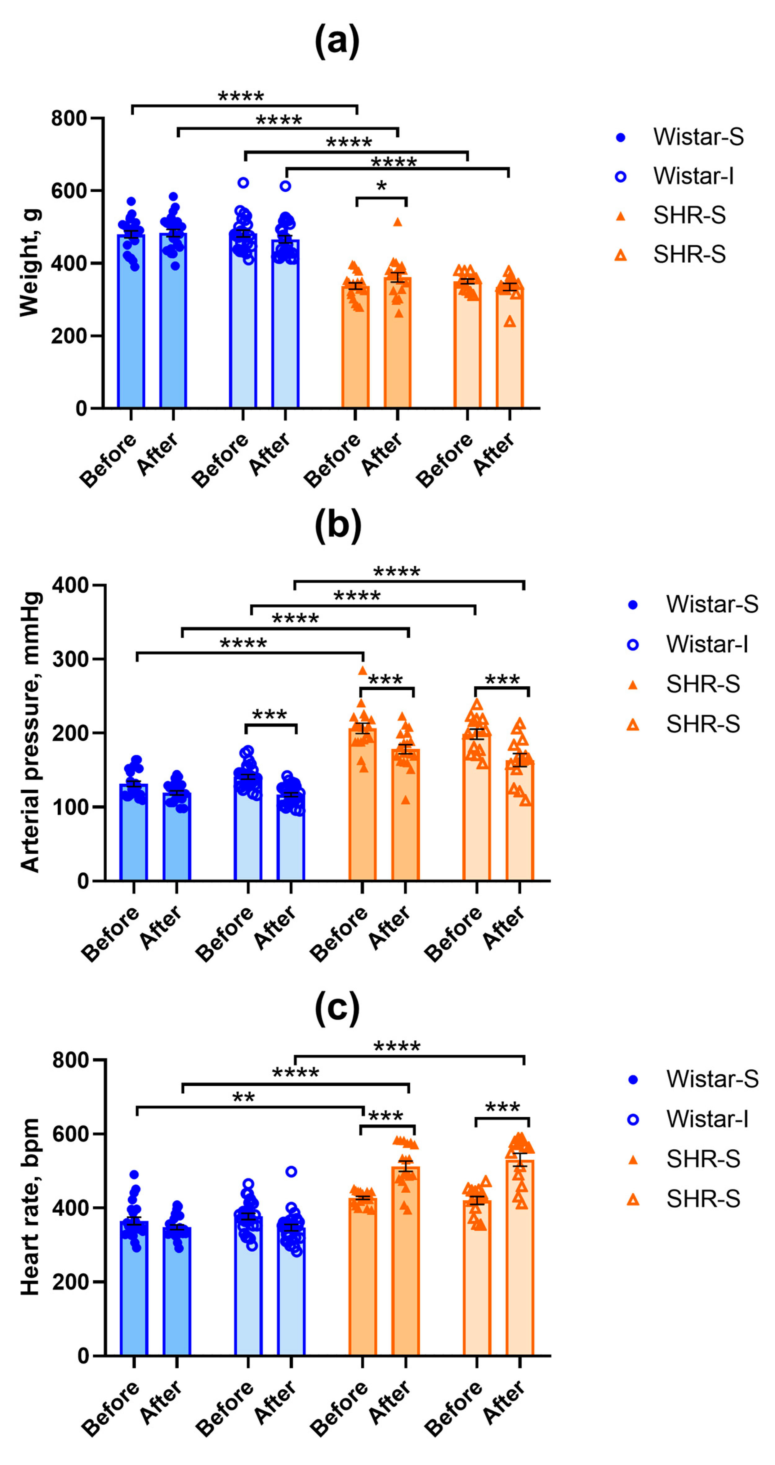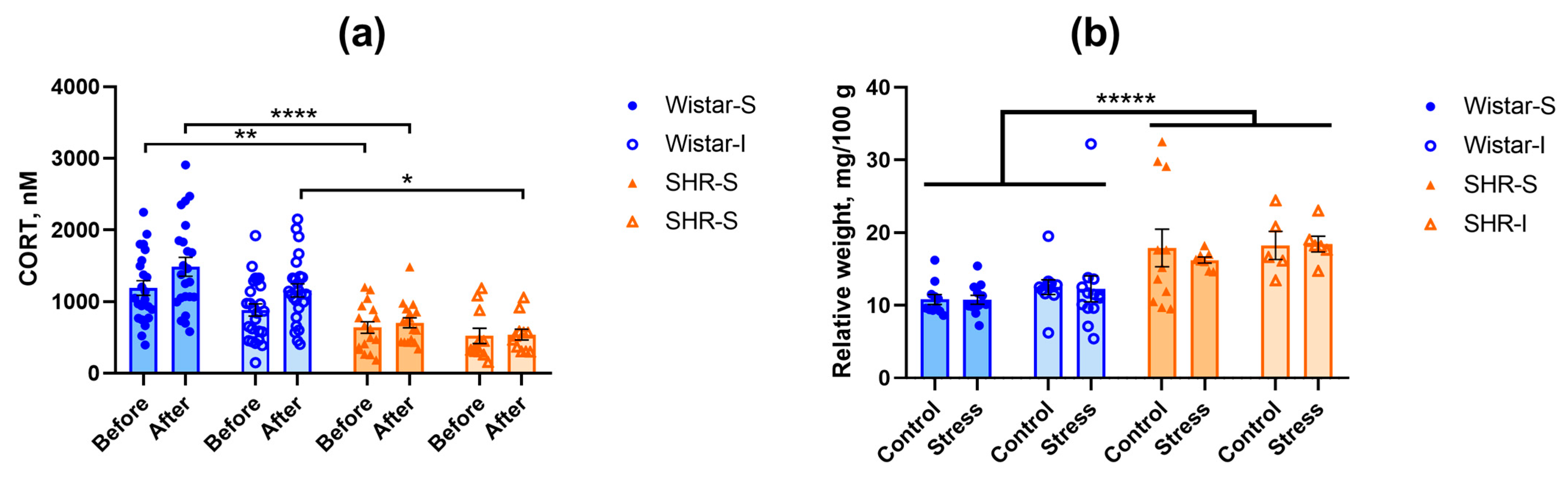 - Vavřínová, A.; Behuliak, M.; Vodička, M.; Bencze, M.; Ergang, P.; Vaněčková, I.; Zicha, J. More Efficient Adaptation of Cardiovascular Response to Repeated Restraint in Spontaneously Hypertensive Rats: The Role of Autonomic Nervous System. Hypertens. Res. 2024, 47, 2377–2392. [Google Scholar] [CrossRef] [PubMed]