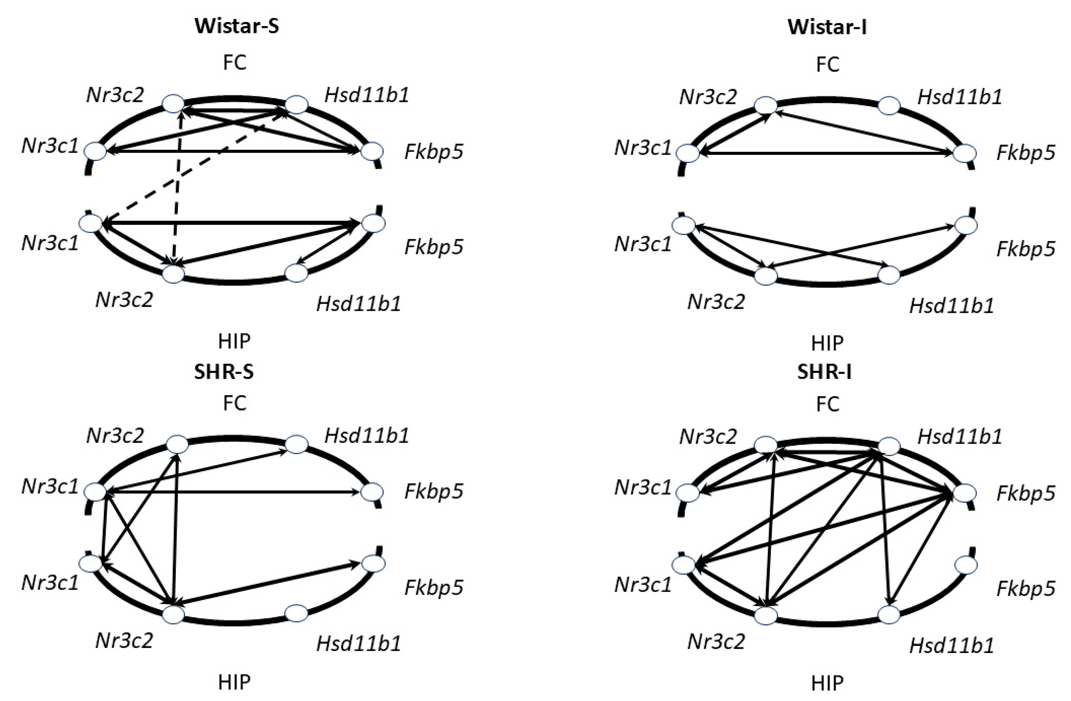 2.5. Prolonged Social Isolation Modifies the Relationships Between mRNA Expression in Hippocampus and Frontal Cortex of Wistar Rats and SHRs