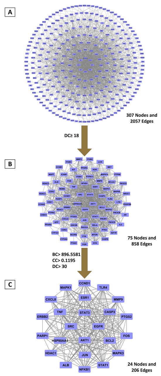 Principal targets derived from PPI network topology analysis. (A) Complete PPI network encompassing 307 overlapping targets; (B) Primary selection applying double-median degree centrality threshold; (C) Core targets selected based on betweenness, closeness, and degree centrality measures exceeding median values.