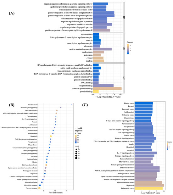 Functional enrichment analysis outcomes. (A) Significantly enriched Gene Ontology (GO) categories across biological processes (BPs), cellular components (CCs), and molecular functions (MFs). (B) Bubble plot and (C) bar chart representation of enriched Kyoto Encyclopedia of Genes and Genomes (KEGG) pathways.