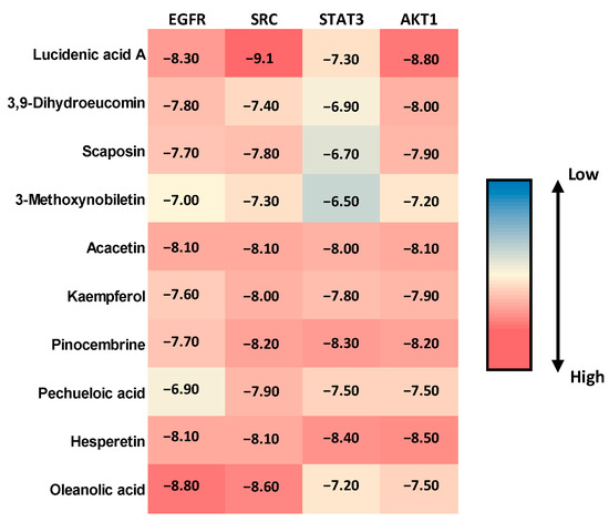 The molecular docking results revealed varied binding affinities across all compound-target combinations, as shown in Figure 3. Lucidenic acid A demonstrated the highest binding affinity against SRC (−9.1 kcal/mol), followed by strong interactions with EGFR (−8.3 kcal/mol) and AKT1 (−8.8 kcal/mol). Oleanolic acid showed particularly strong binding to EGFR (−8.8 kcal/mol) and SRC (−8.6 kcal/mol). Hesperetin exhibited consistently high binding affinities across all targets, with the strongest interaction observed against AKT1 (−8.5 kcal/mol) and STAT3 (−8.4 kcal/mol). Among all tested compounds, the binding scores ranged from −6.5 kcal/mol (3-Methoxynobiletin against STAT3) to −9.1 kcal/mol (Lucidenic acid A against SRC), indicating favorable binding interactions for most compound-target pairs. Acacetin and Pinocembrine demonstrated balanced binding profiles across all four targets, with scores consistently above −8.0 kcal/mol.