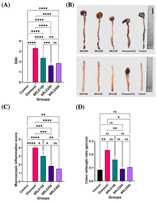 Macroscopic and morphometric analysis confirmed the therapeutic effects of BRLE on colonic inflammation. The diseased control group showed overt signs of inflammation, including colon shortening, thickening, and a significantly elevated macroscopic score and weight-to-length ratio (Figure 4B–D).