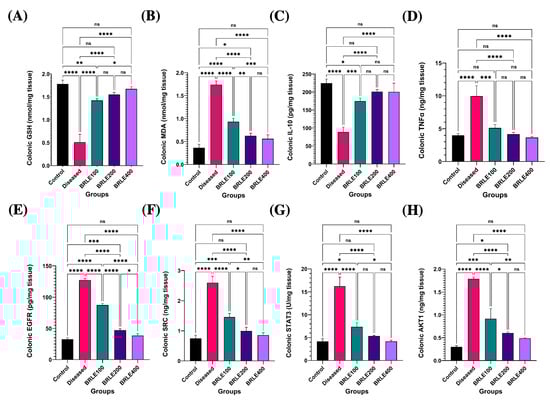 BRLE treatment significantly improved antioxidant status and restored cytokine balance in the colon. In diseased animals, reduced glutathione (GSH) was depleted and malondialdehyde (MDA) was elevated (p < 0.0001). BRLE administration at all doses significantly reversed these effects, with the 200 mg/kg dose being most effective at restoring GSH and reducing MDA to levels comparable to healthy controls (Figure 5A,B).