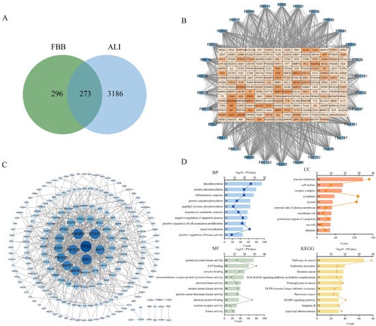 Network pharmacology analysis revealed the multi-target mechanisms of FBB in combating ALI. (A) A Venn diagram illustrated the overlap between potential FBB targets (n = 569) and ALI-associated genes (n = 3459), identifying 273 shared targets for further investigation. (B) The ‘Compound-Target’ interaction network highlighted 30 core flavonoid components (blue ellipses) with the highest degree values and their related ALI targets (red squares). The darkness of the nodes denoted their degree value. (C) Protein–protein interaction analysis of the 273 overlapping targets showed that darker and larger nodes indicated a higher index. (D) Functional enrichment analysis of these overlapping targets revealed the top significantly enriched GO terms and KEGG pathways, screened by a p-value < 0.05. The bar length represented enrichment significance (−log10(p-value)).