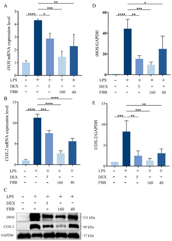 Western blot analysis confirmed (Figure 8D–F) that both 160 mg/L and 40 mg/L FBB significantly reduced LPS-induced expression of COX-2 and iNOS proteins. Specifically, 160 mg/L FBB decreased COX-2 and iNOS proteins by 75.2% and 71.7% (all p < 0.001), respectively, while 40 mg/L FBB reduced them by 55.5% and 46.0% (p < 0.01). Notably, the inhibition of COX-2 by 160 mg/L FBB was significantly stronger than that by DEX (p < 0.05). In contrast, 10 mg/L FBB did not significantly inhibit iNOS protein expression but still resulted in a 33.8% decrease in COX-2 protein.