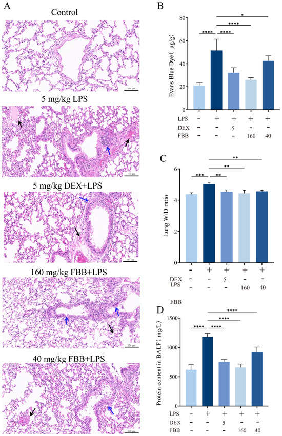 Microscopic observation revealed that the overall structure of the lung tissue in the control group remained essentially normal. Alveolar epithelial cells arranged precisely and orderly, with no abnormalities such as edema or necrosis. Interstitial blood vessels showed no significant congestion or dilation. The bronchial wall thickness, indicated by the blue arrows, was normal, mucus secretion was adequate, and no significant infiltration of inflammatory cells occurred (Figure 4A). The Smith score for this group was 0. In contrast, the lung tissue in the LPS-treated group exhibited significant pathological changes. The alveolar structure sustained severe damage, with extensive areas of collapse, and pathological changes such as bullae and epithelial cell necrosis were evident. Patchy hemorrhages appeared in the interstitial tissue, as indicated by the black arrows. The bronchial wall, also indicated by the blue arrows, thickened significantly, with numerous inflammatory cells infiltrating the lumina. Additionally, the mucus layer within the trachea thickened significantly (Figure 4A). The Smith score for this group was 4. The overall severity of lung tissue lesions was significantly improved in the groups treated with 160 mg/kg FBB and DEX. Alveolar collapse and bullae were observed in localized areas. Slight congestion occurred in the interstitial tissue, as indicated by the black arrow in the figure (Figure 4A). The bronchial wall, marked by the blue arrow, exhibited some thickening, accompanied by a minor infiltration of inflammatory cells. Additionally, the amount of mucus in the trachea increased. The Smith score for both groups was 1. In contrast, the lung tissue lesions in the group treated with 40 mg/kg FBB remained more severe. The alveolar structure collapsed, resulting in the formation of large bullae. Severe patchy hemorrhages were present in the interstitial tissue, as indicated by the black arrow in the figure. The bronchial wall, also indicated by the blue arrow, showed thickening, accompanied by a substantial infiltration of inflammatory cells and a significant increase in mucus in the trachea. The Smith score for this group was 3. The Evans Blue extravasation assay demonstrated that the LPS group exhibited a 2.6-fold increase in dye leakage compared to the control group (p < 0.001). High-dose FBB intervention reduced extravasation by 50.1% (p < 0.001), while low-dose FBB decreased it by 16.9% (p < 0.05; Figure 4B). LPS stimulation significantly increased the lung wet/dry (W/D) ratio, an indicator of tissue water content, by 14.3% (p < 0.001). FBB pretreatment dose-dependently lowered this ratio, achieving reductions of 9.2% and 13.1% relative to the LPS group for the 40 mg/kg (p < 0.01) and 160 mg/kg (p < 0.001) doses, respectively (Figure 4C). Furthermore, FBB treatment significantly attenuated LPS-induced increases in total protein concentrations in BALF, with reductions of 44.1% in the 160 mg/kg group and 22.4% in the 40 mg/kg group (all p < 0.001; Figure 4D). Collectively, these findings indicated that FBB effectively ameliorated LPS-induced pulmonary vascular hyperpermeability, potentially through mechanisms that preserved endothelial barrier integrity and suppressed plasma protein extravasation.