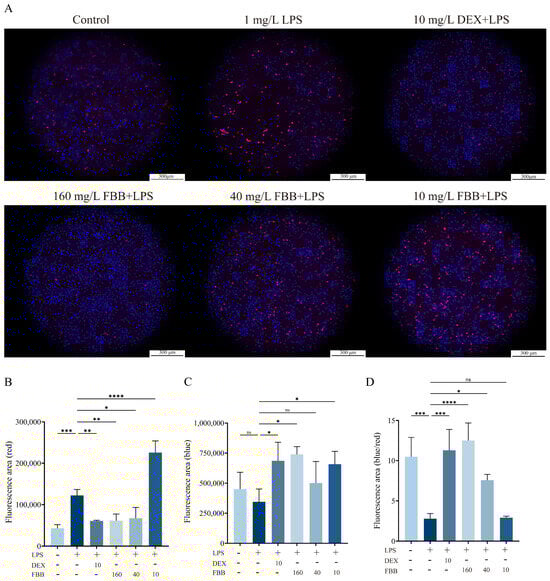 Cells at a concentration of 1 × 105/mL were pre-treated with FBB (ranging from 10 to 160 mg/L) or DEX (10 mg/L) for 1 h before being stimulated with LPS (1 mg/L). After a 24-h incubation period, nuclear staining was conducted using a Hoechst 33342/PI double-staining kit (Solarbio, Beijing, China) to facilitate fluorescence microscopy evaluation.