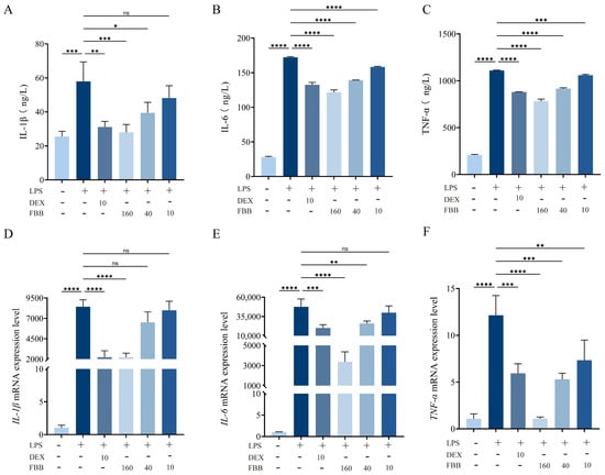 ELISA and qRT-PCR were employed to quantitatively assess the expression and release of pro-inflammatory factors (IL-1β, IL-6, and TNF-α) in RAW264.7 cells. ELISA results (Figure 6A–C) revealed that exposure to 1 mg/L LPS significantly increased the secretion of these cytokines in RAW264.7 murine macrophages compared to control levels: IL-1β rose by 126.7%, IL-6 by 517.2%, and TNF-α by 435.0% (all p < 0.001). Various concentrations of FBB demonstrated a dose-dependent inhibitory effect. At 160 mg/L, FBB reduced IL-1β to 51.7% of the LPS group’s level (restoring it to the basal level), IL-6 to 70.6%, and TNF-α to 70.5% (all p < 0.001). Notably, FBB’s inhibition of IL-6 and TNF-α surpassed that of the positive control drug DEX (p < 0.05). At 40 mg/L, FBB significantly inhibited IL-1β, IL-6 and TNF-α, although its effect was weaker than that of the high-dose group. At 10 mg/L, FBB only reduced IL-6 and TNF-α, with no impact on IL-1β.