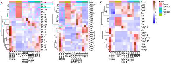 Transcriptional profiling of inflammatory mediators in LPS-stimulated RAW264.7 cells. The heatmap displays the relative expression levels of a panel of inflammatory genes across different treatment groups (from left: Control, LPS (1 mg/L), DEX (10 mg/L) + LPS, FBB (160 mg/L) + LPS, FBB (160 mg/L)). Gene expression was quantified by qRT-PCR and is presented as Z-scores calculated per row (gene). Rows (genes) were clustered using hierarchical clustering with complete linkage. The color key from blue to red represents low to high Z-score values. (A) A subset of interleukin and receptor genes. (B) A subset of chemokine and receptor genes. (C) A subset of other cytokines and receptor genes.