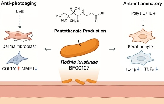 Despite these promising findings, this study had several limitations. First, although pantothenate has emerged as a key mediator, the causality has not been definitively established. Targeted inhibition and neutralization studies are required to validate their direct roles in each phenotype. Second, cytokine regulation was evaluated only at the mRNA level, and direct protein quantification (e.g., by immunochemical assays) was not performed. Therefore, future studies employing ELISA or Western blot analyses are necessary to verify whether transcriptional suppression correlates with actual protein-level changes. Third, the study was limited to in vitro models; in vivo and clinical investigations with diverse populations are essential to confirm efficacy and safety under physiological conditions. It should also be noted that keratinocyte- and fibroblast-based in vitro assays capture only a limited portion of the complex immunological interactions present in living skin. Because cytokine signaling in vivo involves multiple immune cell subsets, barrier–immune crosstalk, and systemic regulatory pathways, the transcriptional changes observed in our simplified models cannot be directly extrapolated to in vivo immune environments. Therefore, the immunomodulatory effects identified here require validation through in vivo or clinical studies to establish their physiological relevance. Finally, BF00107 likely produces additional bioactive metabolites that were not explored in this study. Therefore, comprehensive metabolomic and proteomic profiling is required to fully characterize its functional repertoire.