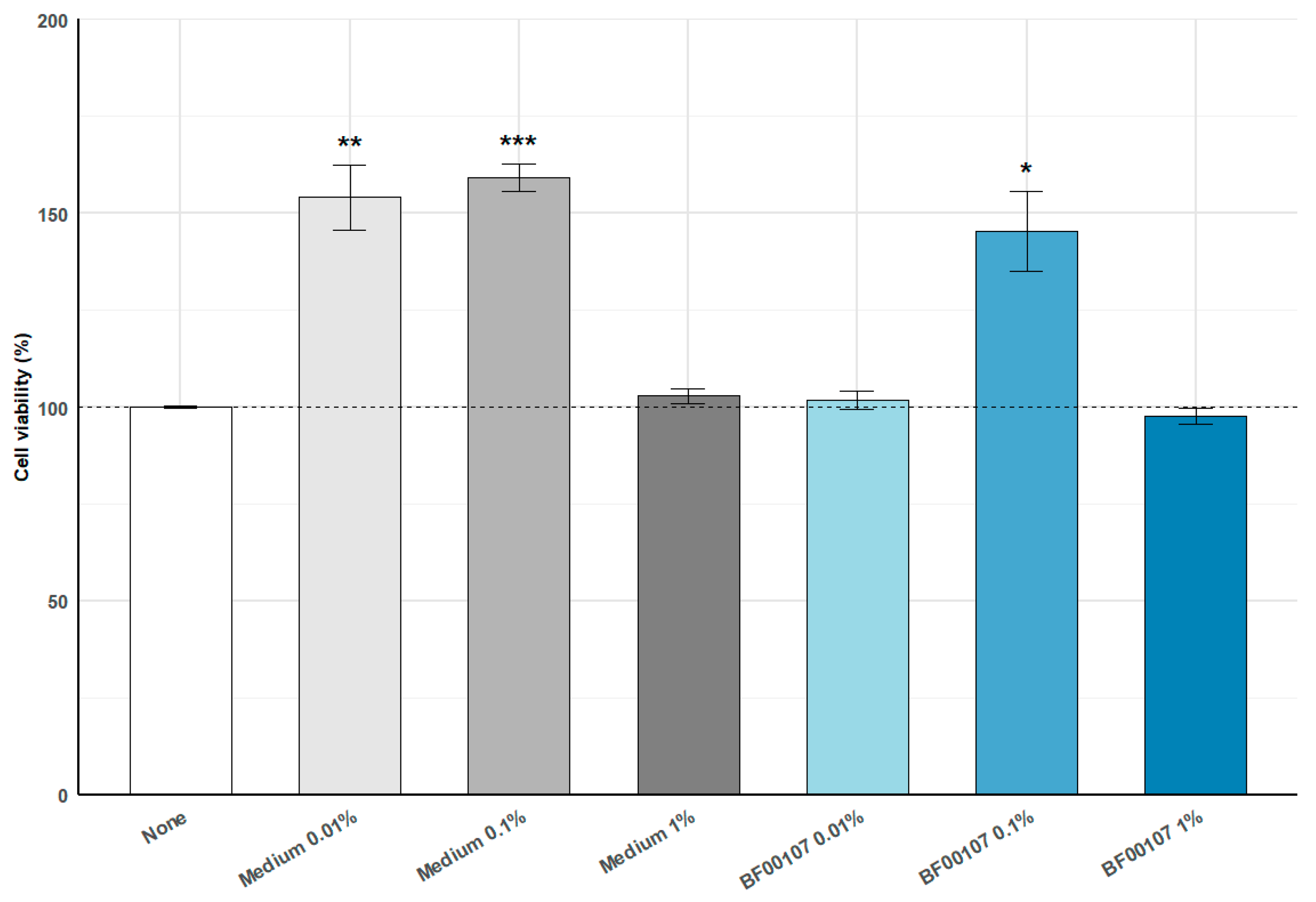 p = 0.394, respectively). These results indicate that low concentrations of medium or BF00107 enhance cell viability without inducing cytotoxicity.