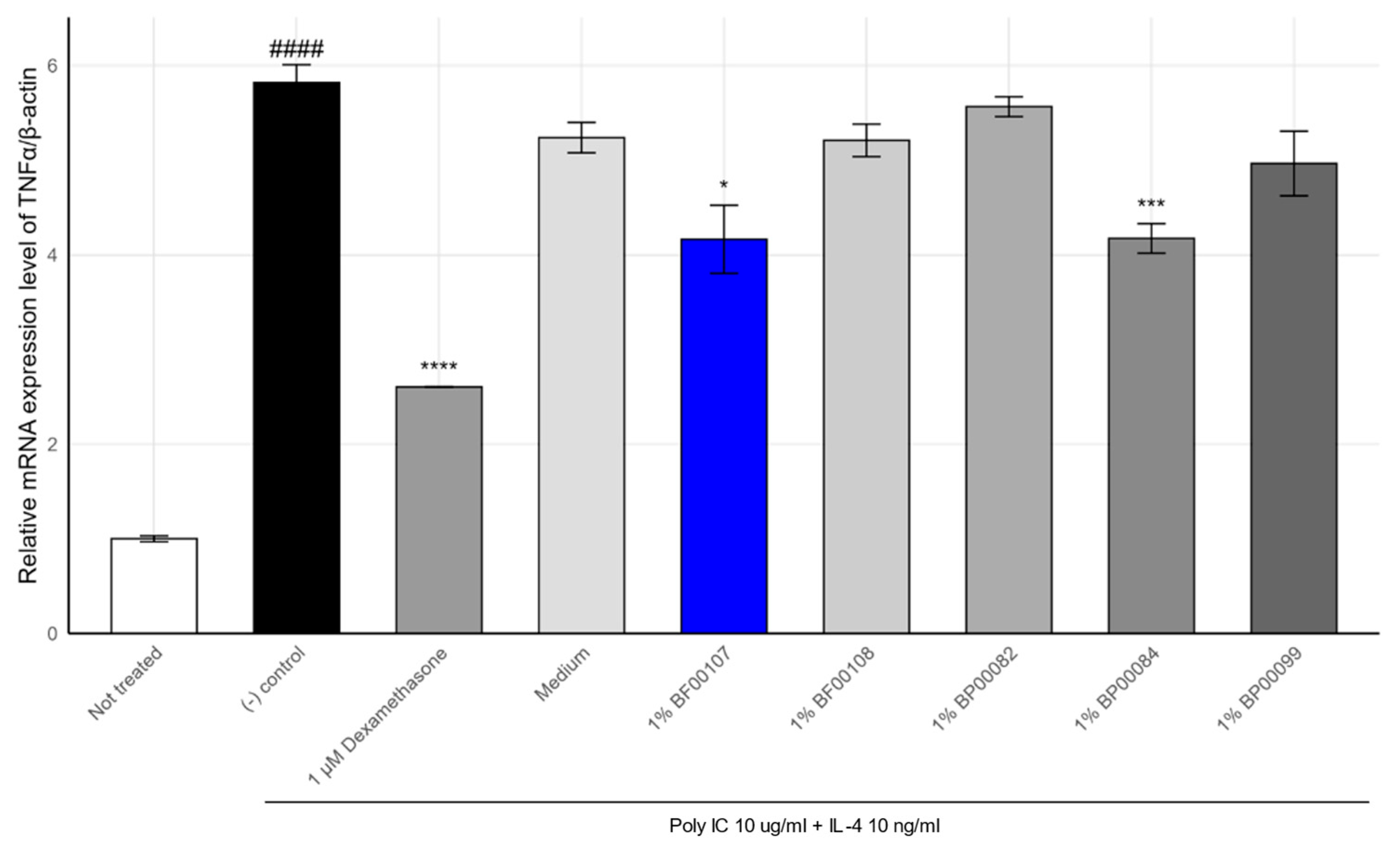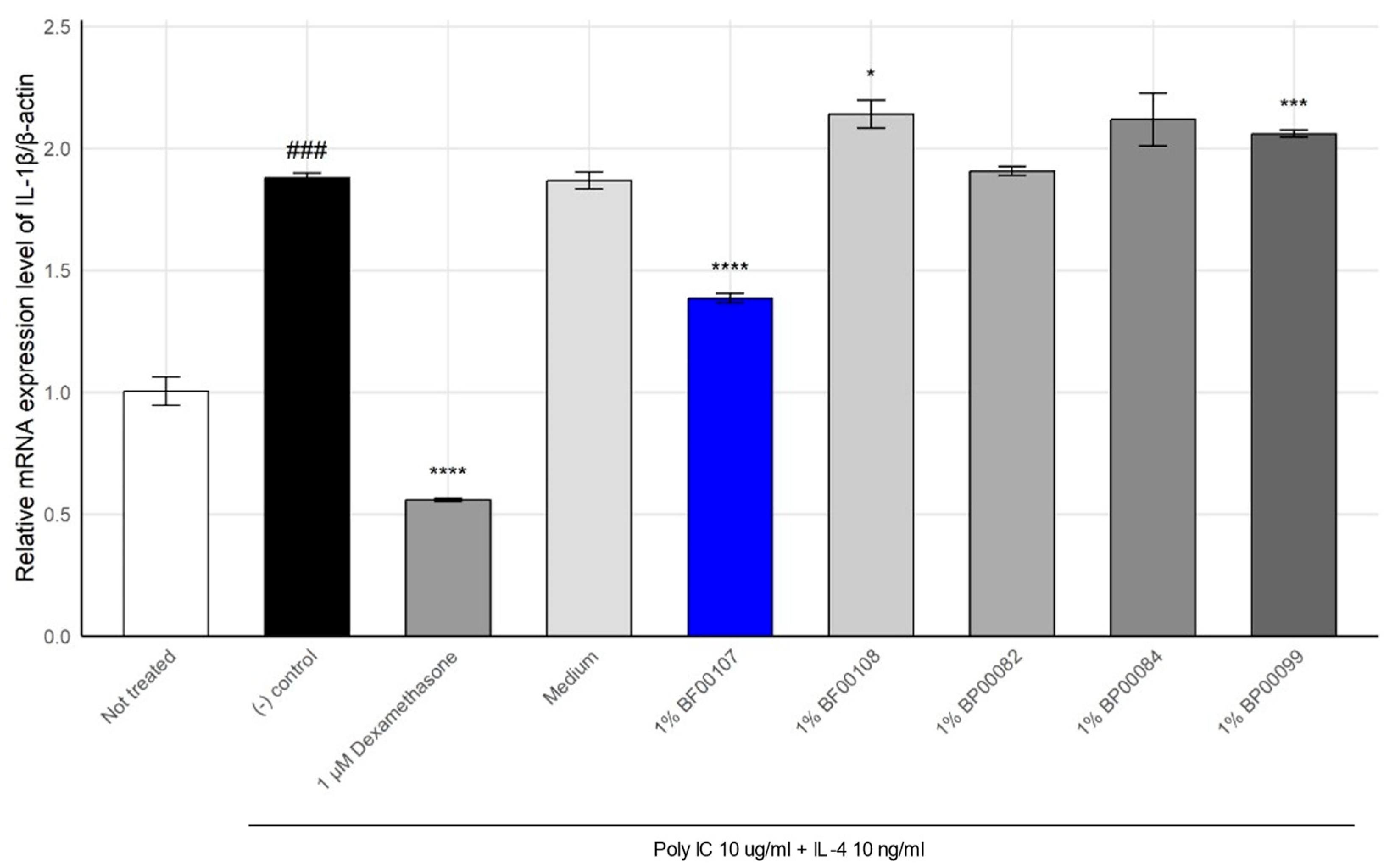At the cellular level, BF00107 markedly suppressed the induction of pro-inflammatory cytokines (IL-1β and TNF-α) in keratinocytes under poly I:C + IL-4 stimulation. The study focused on IL-1β and TNF-α because they are central mediators in keratinocyte-dependent inflammatory cascades [