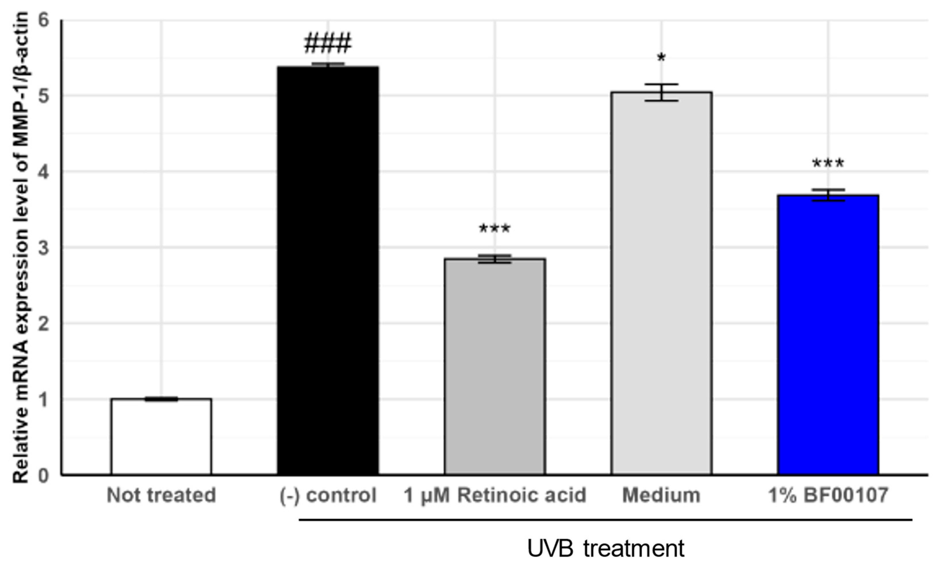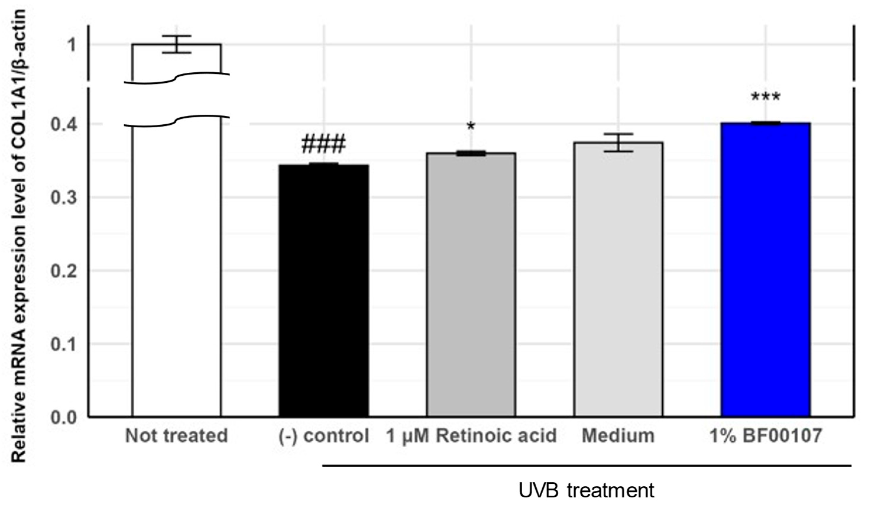 BF00107 treatment restored COL1A1 expression and attenuated MMP-1 upregulation in fibroblasts exposed to UVB irradiation, suggesting a dual action: enhancement of collagen synthesis and prevention of extracellular matrix degradation. This opposing regulation of COL1A1 and MMP-1 reflects the fundamental imbalance between collagen synthesis and degradation that characterizes UV-induced dermal aging, and the ability of BF00107 to modulate both pathways suggests a coordinated protective effect on extracellular matrix integrity [
