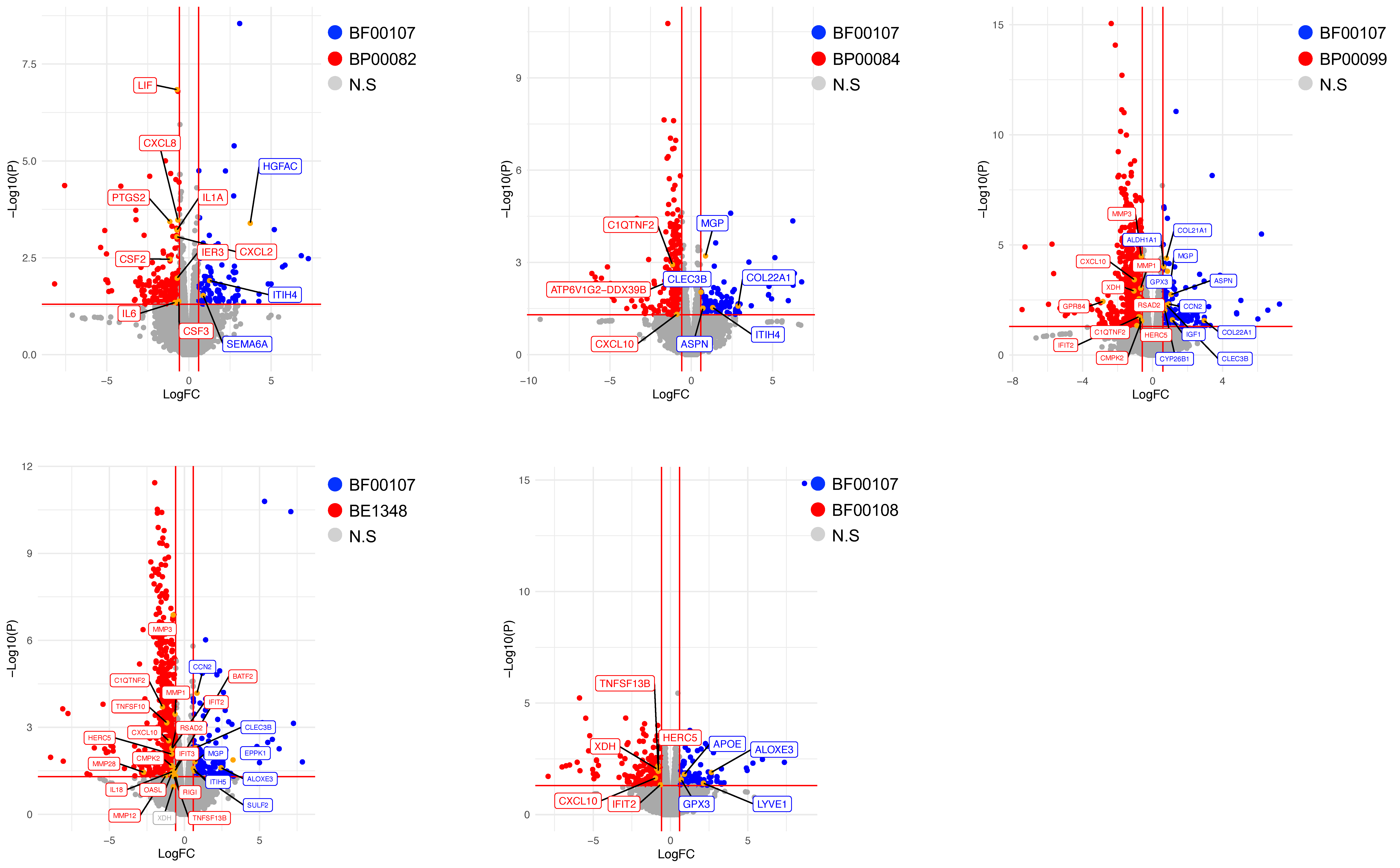 25]. The expression changes observed in our analysis reflect their established involvement in maintaining or reconfiguring tissue architecture under stress or injury. This coordinated response demonstrates that BF00107 not only suppresses inflammation but also reinforces structural and barrier-related pathways. These signatures were absent in the fibroblasts treated with other