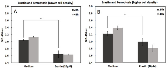 Erastin-induced cell death in MC3T3-E1 cells at low and high seeding densities. Cell viability was measured by MTS assay 24 h and 48 h after treatment with erastin (20 μM) compared with medium controls. (A) At lower cell density, erastin significantly reduced viability at both time points. (B) At higher cell density, cells similarly showed reduced viability following erastin treatment, with a more pronounced decline at 48 h. Data are presented as mean ± SD. ** indicates p < 0.05.