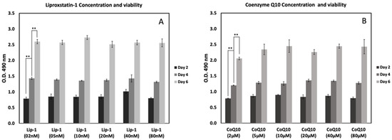 Effects of Liproxstatin-1 (Lip-1) and Coenzyme Q10 (CoQ10) concentrations on MC3T3-E1 cell viability at different time points. Cells were treated with increasing concentrations of Lip-1 (2–80 nM) (A) or CoQ10 (2–80 μM) (B), and viability was assessed by MTS assay on days 2, 4, and 6. Both compounds showed dose-dependent and time-dependent effects on cell metabolic activity, with higher readings observed at later time points. Data represent mean ± SD. ** indicates p < 0.05.