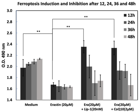 To evaluate the dynamics of ferroptosis and its inhibition, cells were treated with erastin (20 µM) alone or in combination with Lip-1 (20 nM) or CoQ10 (2 µM), and cell viability was assessed at 12, 24, 36, and 48 h using absorbance at 490 nm (Figure 3). Cells in medium alone showed increased viability over time, whereas treatment with erastin significantly reduced optical density at all time points, confirming effective ferroptosis. Cells were treated with medium (Med), erastin (20 µM), or co-treated with either Lip-1 (20 nM) or CoQ10 (2 µM). Cell viability was measured at 12, 24, 36, and 48 h by measuring the absorbance at 490 nm. Erastin significantly reduced viability at all time points, whereas Lip-1 and CoQ10 effectively rescued cell viability, particularly 12 h after treatment. The protective effects of both inhibitors declined over time, although they remained partially effective at 48 h. Data are presented as the mean ± standard deviation (SD).