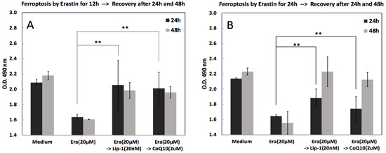 Post-treatment recovery from erastin-induced ferroptosis after early (12 h) or prolonged (24 h) exposure. MC3T3-E1 cells were first treated with erastin (20 μM) for either 12 h (A) or 24 h (B), followed by removal of erastin and rescue with Liproxstatin-1 (20 nM) or CoQ10 (2 μM). Cell viability was assessed 24 h and 48 h after rescue. Erastin alone significantly reduced cell viability, whereas subsequent treatment with Lip-1 or CoQ10 promoted partial recovery, with a more pronounced effect observed in the 12-h induction condition. Data represent mean ± SD. ** indicates p < 0.05.