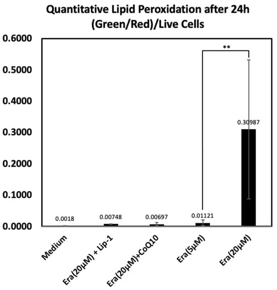 Quantitative lipid peroxidation analysis based on C11-BODIPY oxidation after 24 h. Green (oxidized) and red (reduced) fluorescence intensities were measured and normalized to the number of Hoechst-positive live cells using ImageJ, a web-based implementation (http://ij.imjoy.io) provided by the National Institutes of Health (NIH, Bethesda, MD, USA). Cells exposed to 20 µM erastin displayed a significant increase in lipid peroxidation, whereas Liproxstatin-1 and CoQ10 co-treatments effectively reduced oxidative lipid damage. Lower erastin concentration (5 µM) resulted in only minimal oxidation. Data represent mean ± SD. ** indicates p < 0.05.