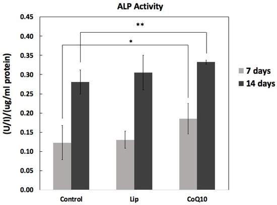 Effect of Liproxstatin-1 and Coenzyme Q10 on ALP activity on days 7 and 14. ALP activity was measured in the cell lysates and normalized to protein content. The results are shown as mean ± SD (n = 5). Both Lip and CoQ10 increased ALP activity compared to that in the control, with CoQ10 showing a more pronounced effect. Statistical analysis: * p < 0.05, ** p < 0.01 versus control.