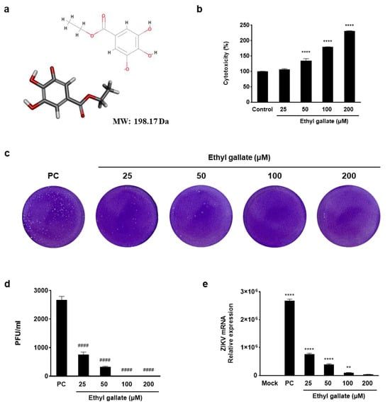 Antiviral activity of ethyl gallate in Zika virus-infected Vero E6 cells. The two−dimensional (2D) and three−dimensional (3D) chemical structures of ethyl gallate (a) (oxygen atoms: red; carbon atoms: gray; hydrogen atoms: light gray) and cytotoxicity of ethyl gallate in Vero E6 cells (b). Plaque image (c) and titer (d) on antiviral activity of ethyl gallate using a plaque assay. Effect of ethyl gallate on Zika virus NS1 mRNA expression level (e). The data represent mean ± standard deviation from triplication. ** p < 0.002, **** p < 0.0001 as compared to the Mock group. #### p < 0.0001 as compared to the positive control (PC) group.