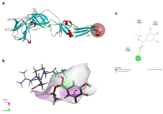 Docking poses of ethyl gallate to the envelope protein of the Zika virus. The three-dimensional (3D) whole structure of the docked complex (a). α-Helices are rendered in red, β-sheets in cyan, and the red sphere indicates the active site where the ligand interacted. The 3D structure of the interacting part of the docked complex (b). The 2D ligand interaction diagram (c).
