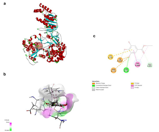 Docking poses of ethyl gallate to the RdRp of the Zika virus. The three-dimensional (3D) whole structure of the docked complex (a). α-Helices are rendered in red, β-sheets in cyan, and the red sphere indicates the active site where the ligand interacted. The 3D structure of the interacting part of the docked complex (b). The 2D ligand interaction diagram (c).