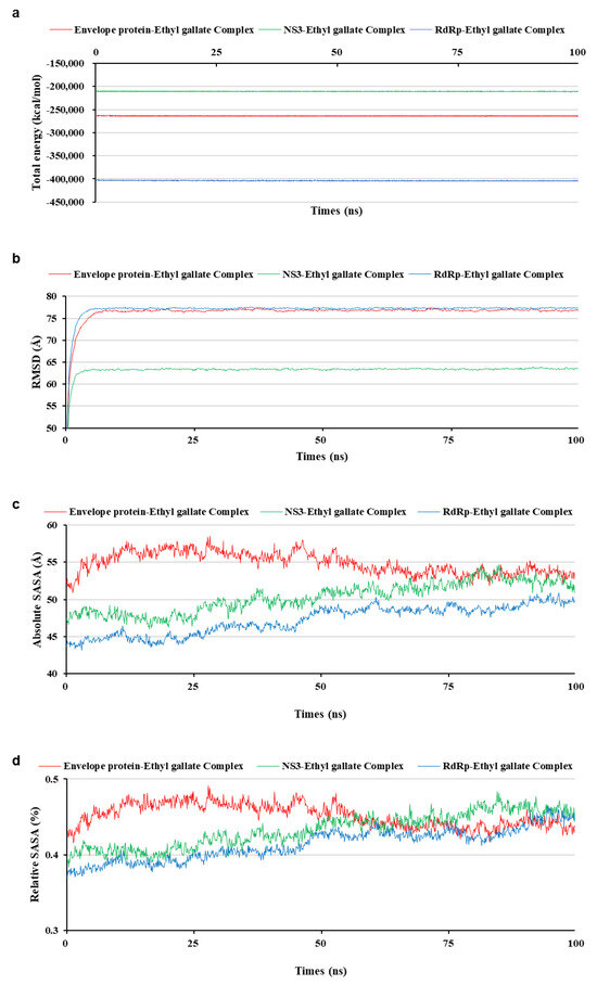 Stability of each solvated whole complex during molecular dynamic simulation. Total energy (a), root mean square deviation (b), absolute solvent-accessible surface area (SASA) (c), and relative SASA (d).