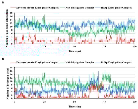 Interaction bond comparison of three protein-ethyl gallate complexes during molecular dynamic simulation; non-bond interaction (a) and hydrogen bond (b).
