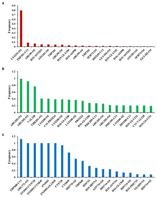 Frequency of non-bonded interactions during molecular dynamic simulation. Envelope protein-ethyl gallate (a), NS3-ethyl gallate (b), and RdRp-ethyl gallate (c).
