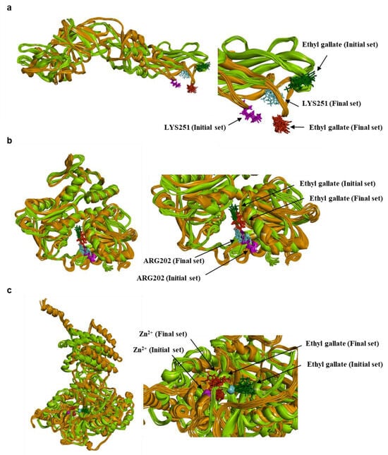 Conformational change during MD simulation. Envelope protein-ethyl gallate (a), NS3-ethyl gallate (b), and RdRp-ethyl gallate (c). Green color family (protein: light/forest green; ethyl gallate: forest green; residues: cyan); Initial 10 conformations, Orange color family (protein: orange; ethyl gallate: red; residues: pink); Final 10 conformations.