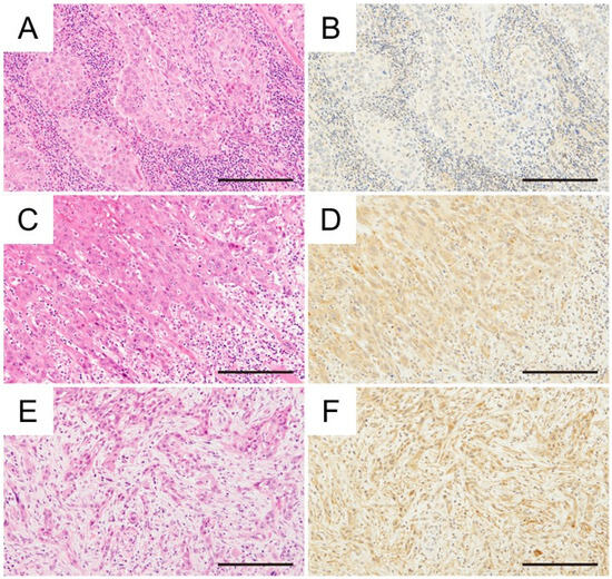 Immunohistochemical investigation between the mode of invasion and CD36 expression in OSCC (H&E staining, immunohistochemical CD36 staining) (A,B) Grade 3, tongue cancer, H-score: 77.0. (C,D) Grade 4C, tongue cancer, H-score: 125.6. (E,F) Grade 4D, tongue cancer, H-score: 135.2. Magnification ×400, scale bar: 200 μm.