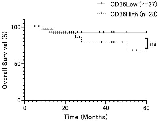 Overall survival rate of patients with OSCC according to CD36 expression (p = 0.42). Overall survival rates showed no significant difference. The x-axis represents time (months), and the y-axis represents overall survival (%). ns: not significant.