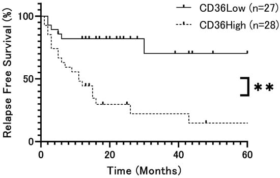 Relapse-free survival rate of patients with OSCC according to CD36 expression (p = 0.0002). Relapse-free survival rates were significantly lower in patients with high CD36 expression than in those with low CD36 expression. The x-axis represents time (months), and the y-axis represents relapse-free survival (%). **: p < 0.01.